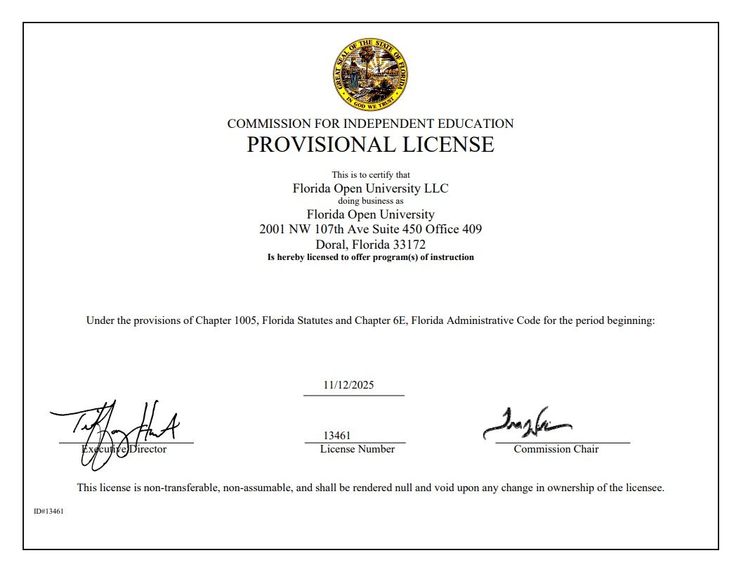 The Florida Open University is licensed by the Florida Commission on Independent Education, Florida Department of Education, License #13461. You can obtain additional information about this institution by contacting the Commission at: 325 West Gaines St., Suite 1414, Tallahassee, FL, 32399-0400; Toll-free telephone number (888) 224-6684 (www.fldoe.org/cie).